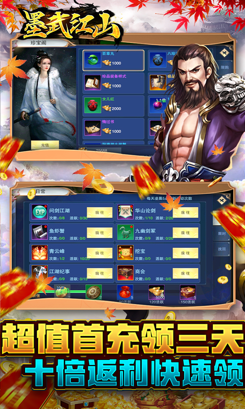 《墨武江山》是一款多人在线角色扮演游戏。上线即送满级VIP+8800000铜钱+66666黄金+88888绑定黄金+千元充值卡!完成每日活跃任务,抽取欧皇转盘获得真充卡!组队PK、与各高手线上竞技,杀怪掉充值,轻松玩转武侠世界!
