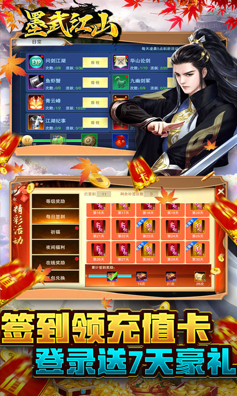 4、每日签到好礼多多!每日即可领取游戏充值卡,更有豪华签到天金神将等你来领!