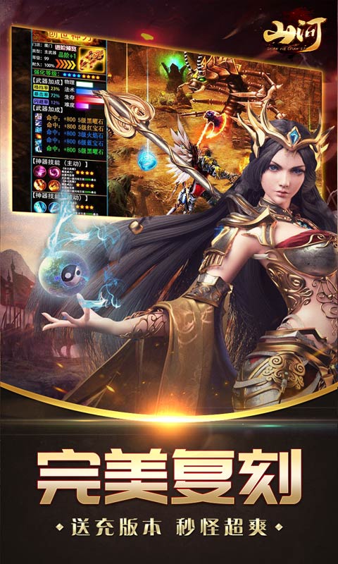 《山河》是一款经典超级福利的单职业超变传奇手游,上线送神宠,充值货币说爆就爆,打怪爆率超高刀刀爆光柱,攻速拉满,玩法超多,打BOSS超爽,冲就完事了!