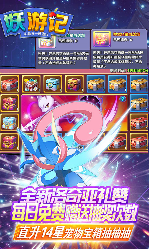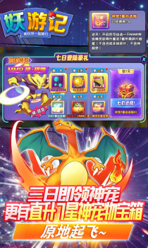 ★七日登录豪礼,神级精灵-“炎帝”,四日登录即送“闪光7星自选宝箱”,7日登录即送“神宠7星自选宝箱”