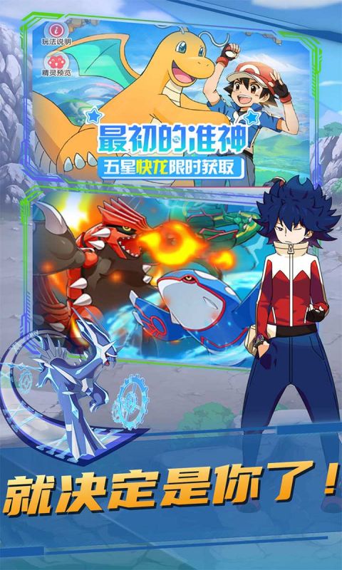 就决定是你了!开局赠送皮卡丘、喷火龙、妙蛙种子等经典强力五星精灵!拥有近二百只精灵形态待解锁收集。强力装备系统,多系多职业精灵养成,天赋宝石自由搭配,高自由度组成属于你的最强阵容!竞技场中同台竞技;公会战内巅峰对决;跨服天梯争夺最强,超多玩法等待一一体验。小精灵与你一路相伴!