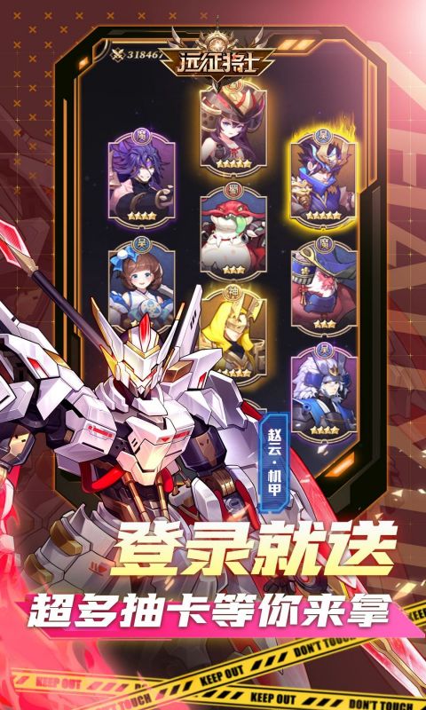 《远征将士》是一款新潮机甲三国放置卡牌手游。集策略,战斗、割草于一体,全新战斗机制,武将自定义养成,打造专属阵容,养成资源0损耗,6V6经典回合战斗,助你闯荡不一样的三国,这个三国有点燃!