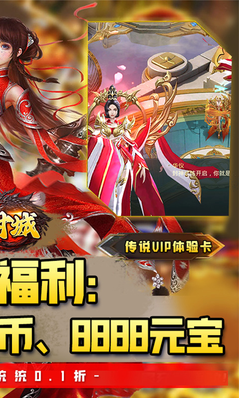 所有档位统统0.1折!登录即送1666万绑定铜币、8888元宝、12万绑定元宝、白金VIP激活卡、VIP14直升卡、传说VIP体验卡