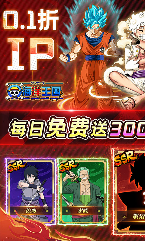 《海洋王国》0.1折IP联动免费版,每天送3000元平台代金券!梦幻联动经典突破!民工漫IP大集结,海贼与龙珠火影联动,更有充值永久0.1折!路飞携手悟空和鸣人,一起寻找伙伴共闯新世界。好激动哦,下个联动人物是谁呢?